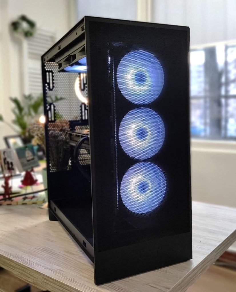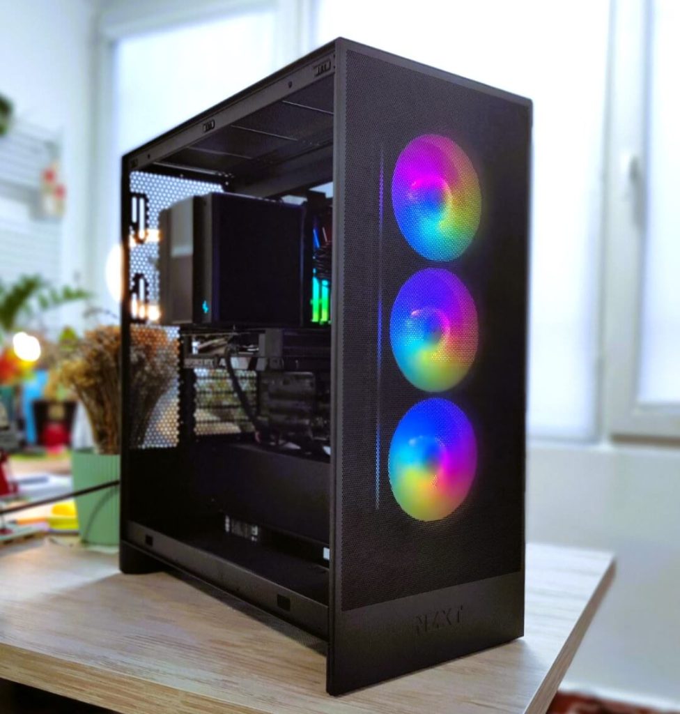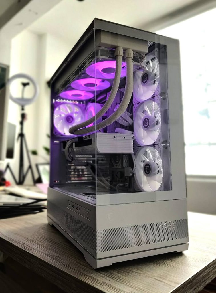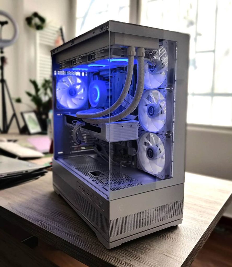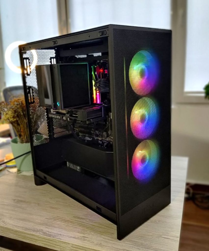 Сè е сместено во NZXT H7 Flow RGB (2024) – куќиште познато по одличен airflow, минималистички дизајн и премиум изработка. Дополнителниот Arctic P12 вентилатор обезбедува уште подобра циркулација на воздух, што значи пониски температури и потивка работа.