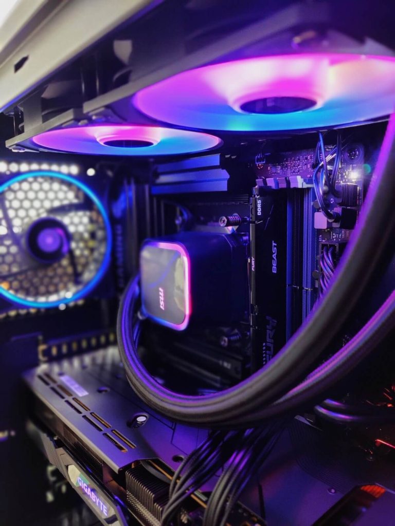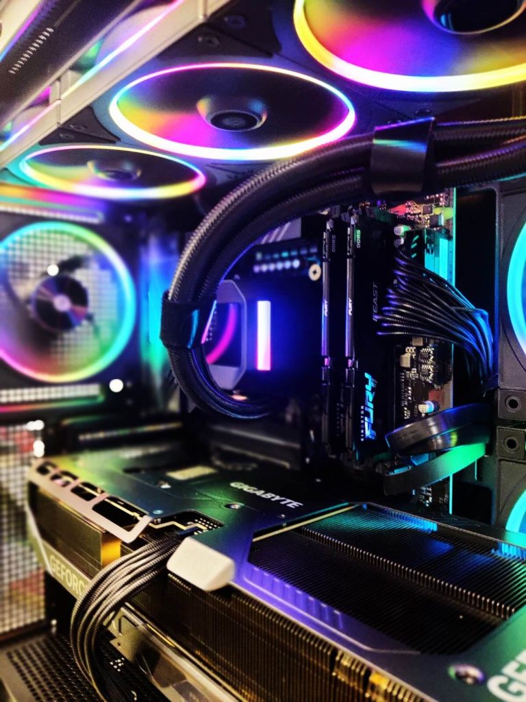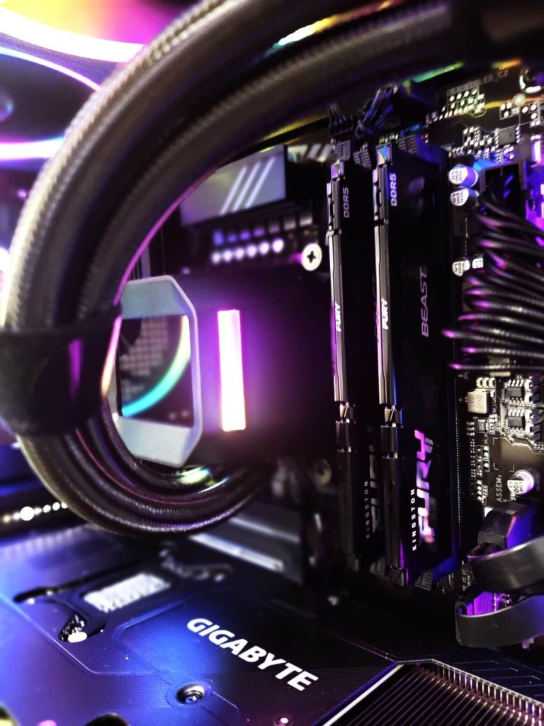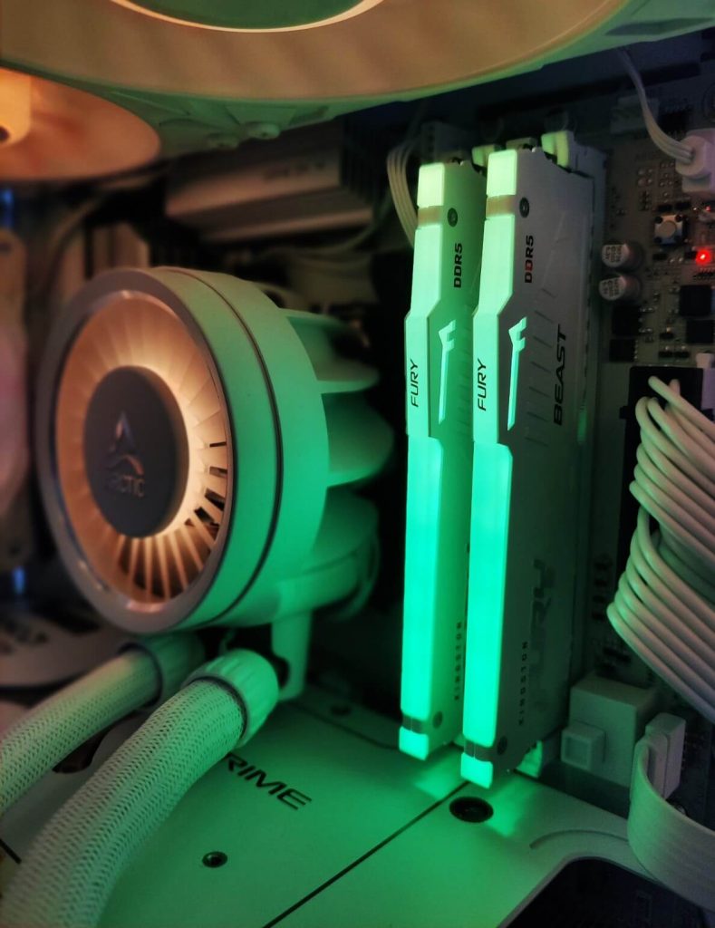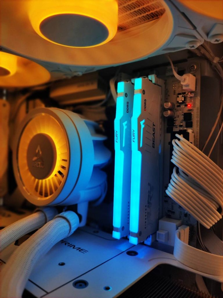 Меморискиот сегмент е составен од 32GB DDR5 (2x16GB) Kingston Fury Beast RGB White на 6000MHz, што обезбедува идеален баланс помеѓу капацитет и брзина. Овој сетап е повеќе од доволен за модерни игри, стриминг и работа со повеќе апликации истовремено. RGB осветлувањето дополнително придонесува за визуелниот изглед на конфигурацијата.