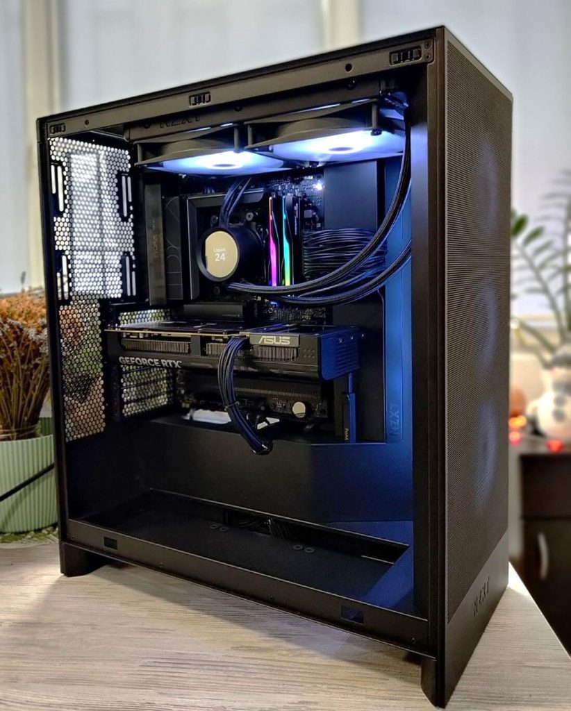 Сите компоненти се сместени во NZXT H7 Flow RGB (2024) Black, куќиште познато по одличниот проток на воздух и чист минималистички дизајн. Карактеристики: Оптимизиран front mesh за подобар airflow, простор за high-end компоненти, RGB акценти за модерен изглед, одлична организација на кабли