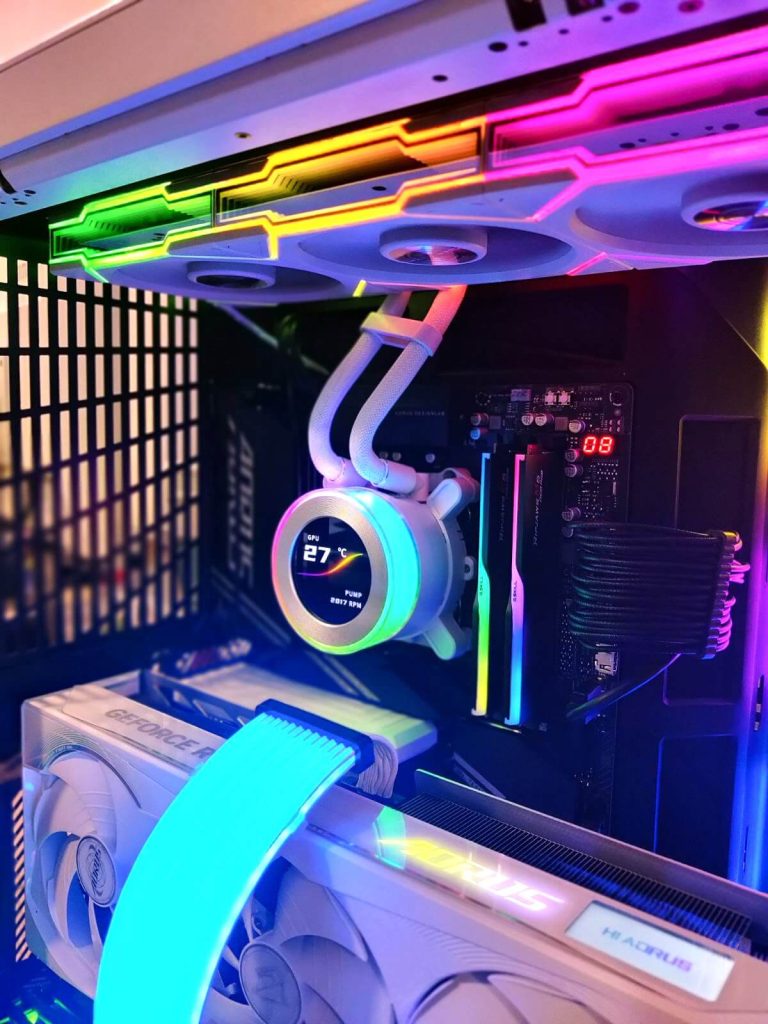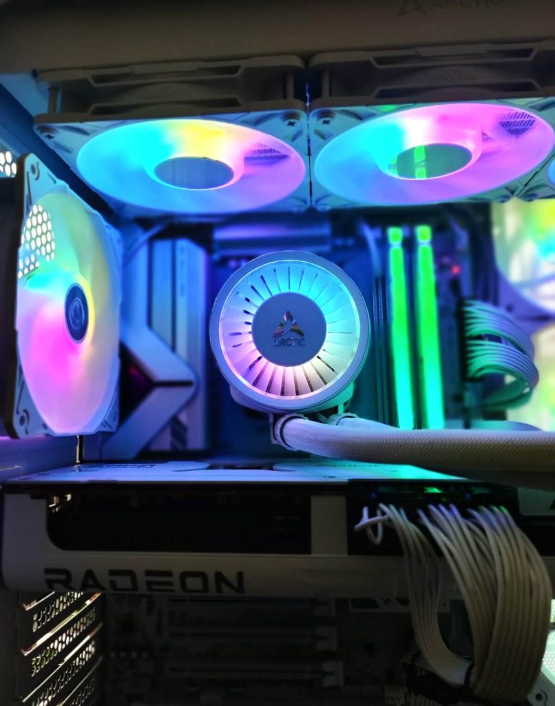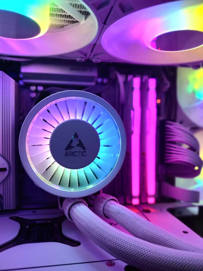 Температурната контрола е доверена на Arctic Liquid Freezer III Pro 360 A-RGB White, премиум течен ладилник со 360mm радијатор. Овој систем овозможува одлична дисипација на топлината и стабилни температури дури и под висок load, што е особено важно за одржување на максимални перформанси. Дополнително, ARGB осветлувањето совршено се вклопува во целокупниот изглед.