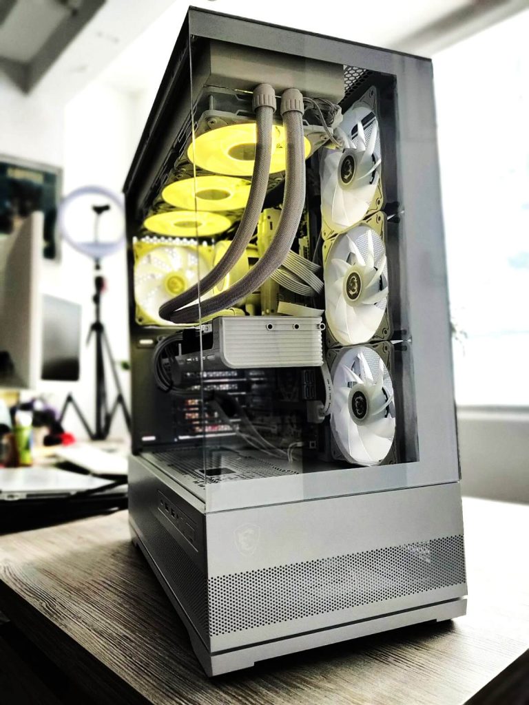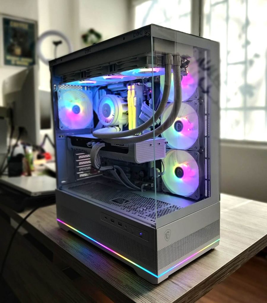 Сите компоненти се сместени во MSI MAG PANO 110R PZ White ARGB куќиште, кое комбинира одличен airflow, модерен изглед и простор за high-end компоненти. Со панорамски дизајн и ARGB елементи, куќиштето овозможува системот да изгледа импресивно од секој агол.